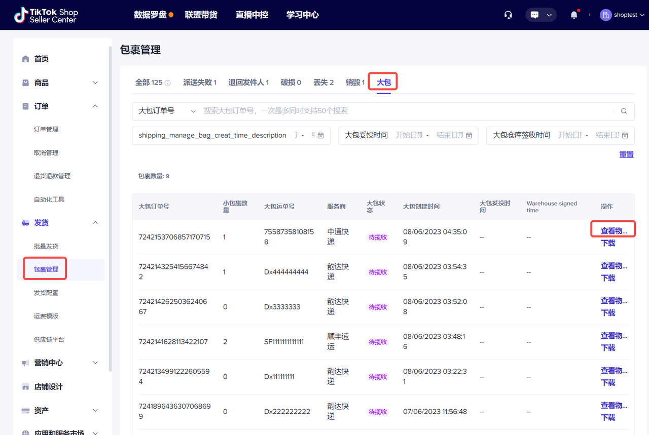 1、大包列表:查看所有已上传的发货预报。
