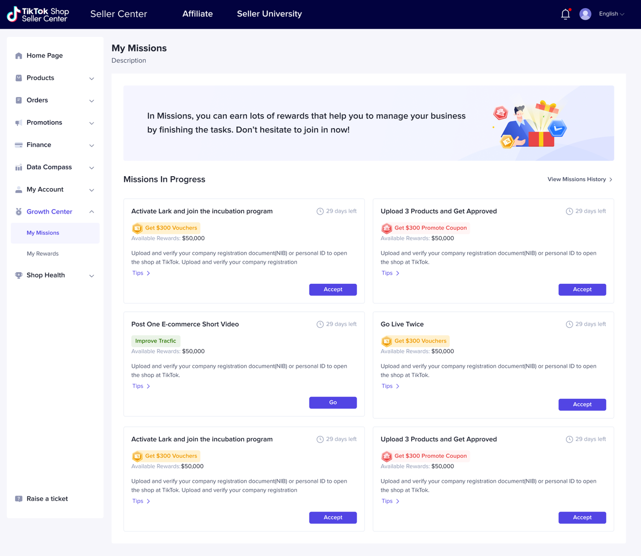 首先,你需要先完成开店必做任务,才能参与我们提供的商家任务。如果你还没完成的话,快点查看Easy Steps to Kick-start Your Business in TikTok Shop,去完成它吧!