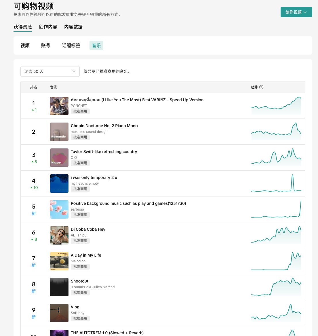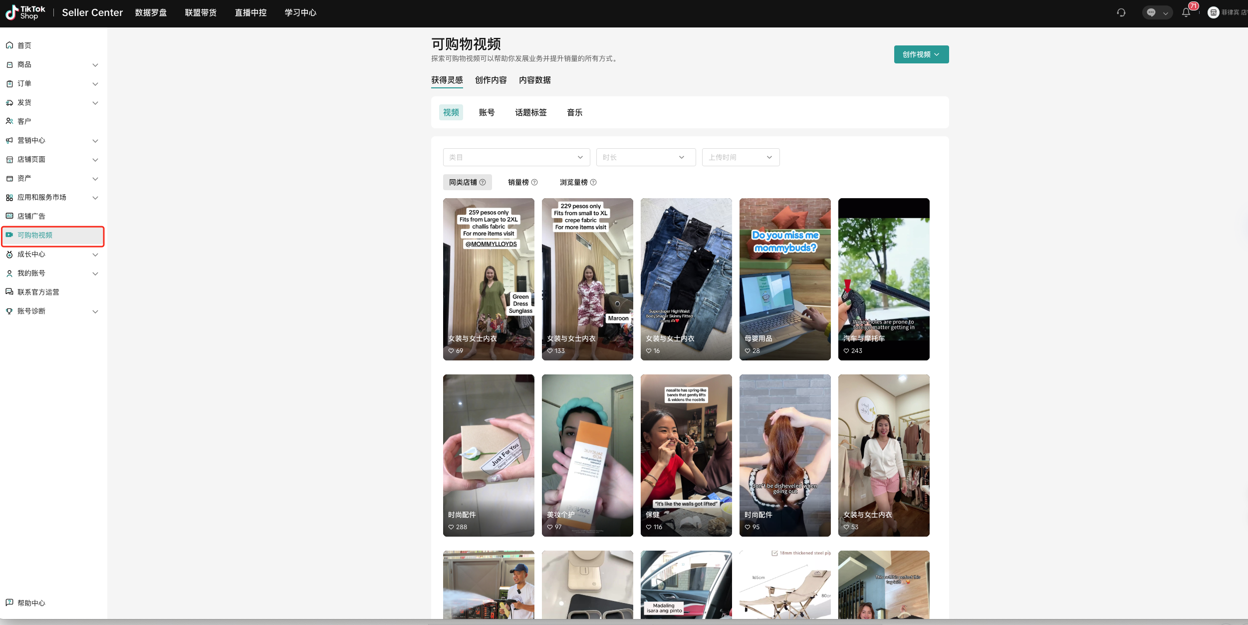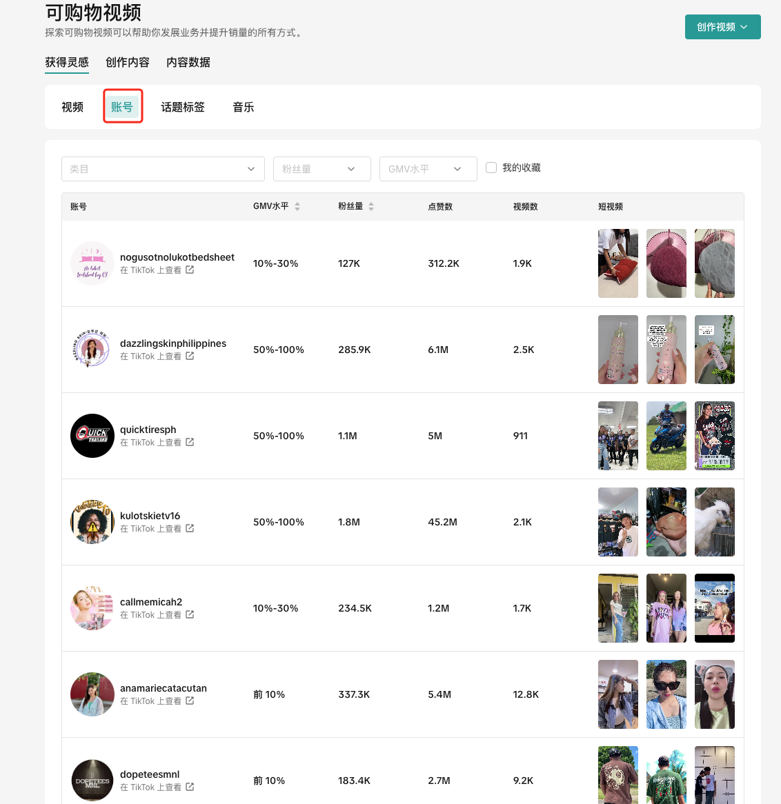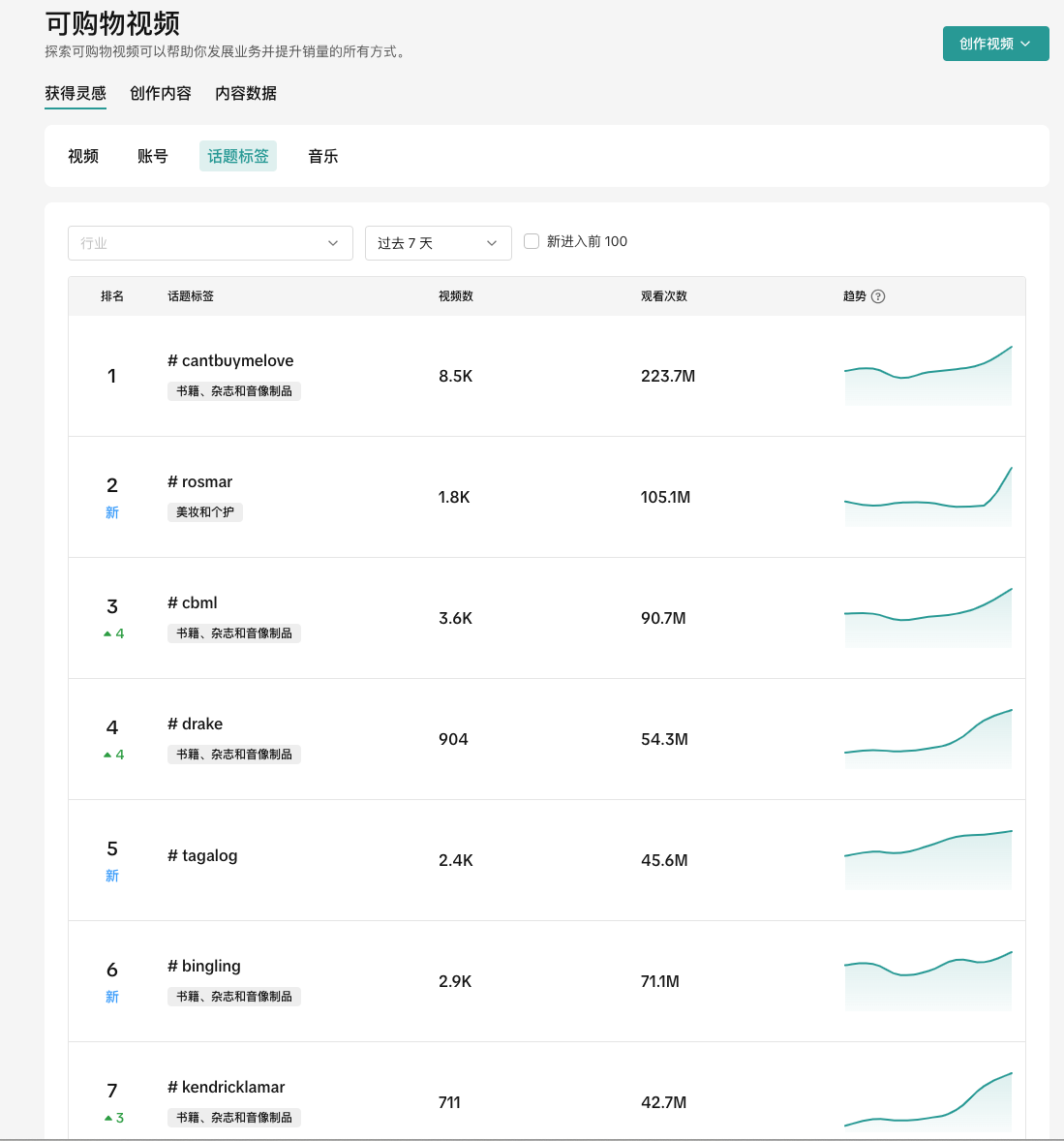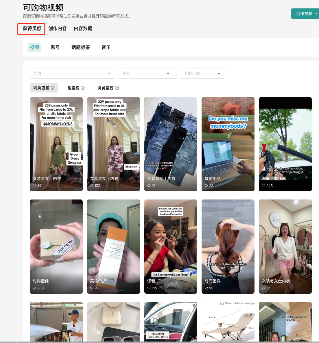 可以看到目前TikTok Shop最流行的视频、账号、话题标签、音乐