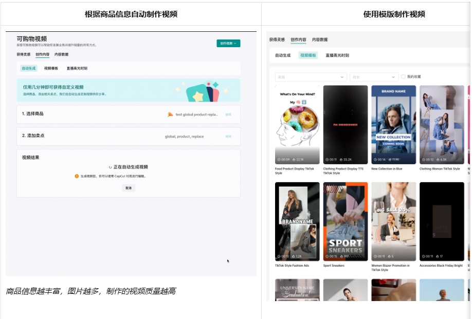 1.自动生成(暂时仅对部分国家开放):根据所选择商品,和您提供的卖点快速生成视频