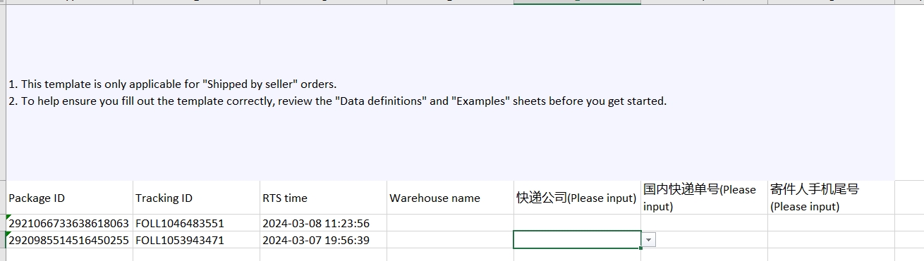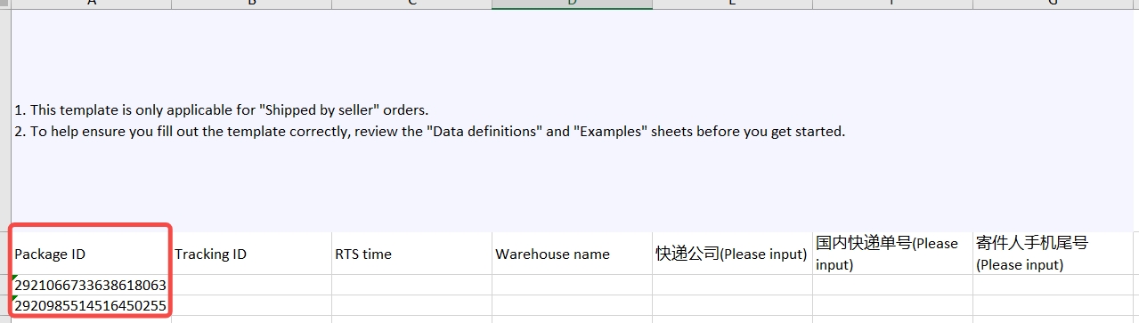商家也可以选择下载空白模块进行填写和上传。商家只需在Package ID列填写需要发货预报的订单即可。