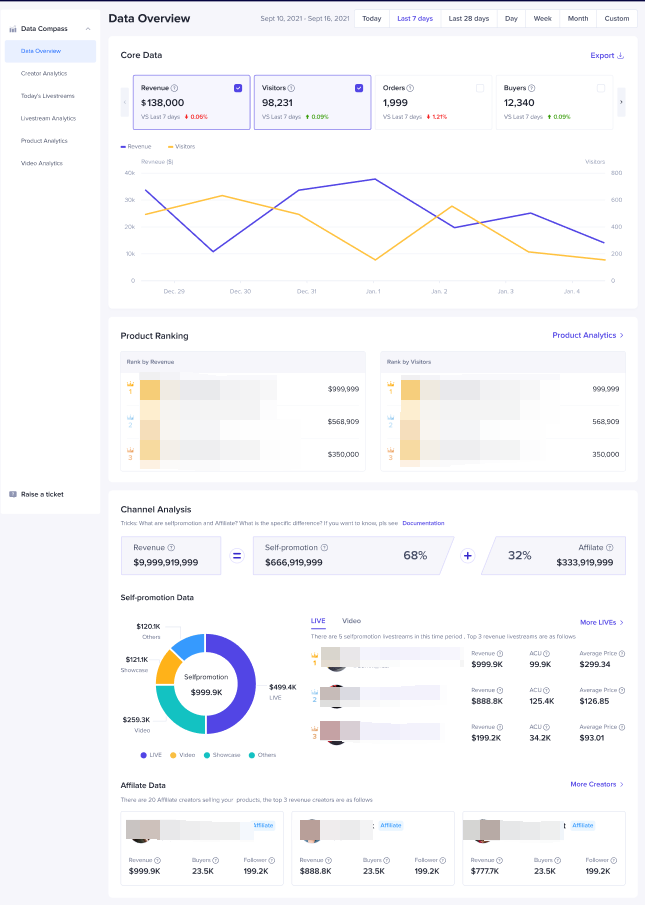 成交金额、访客数、成交订单数、成交人数、成交件数、商品曝光次数、商品点击次数、转化率、退款金额、成交商品数 // revenue, visitors, orders, buyers, unit sales, product view, product reach, conversion rate,refunds, products