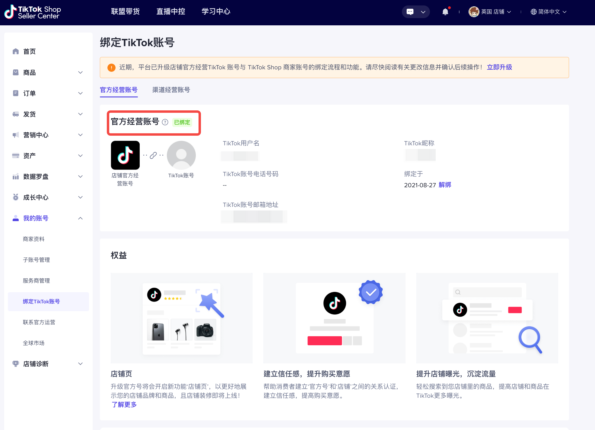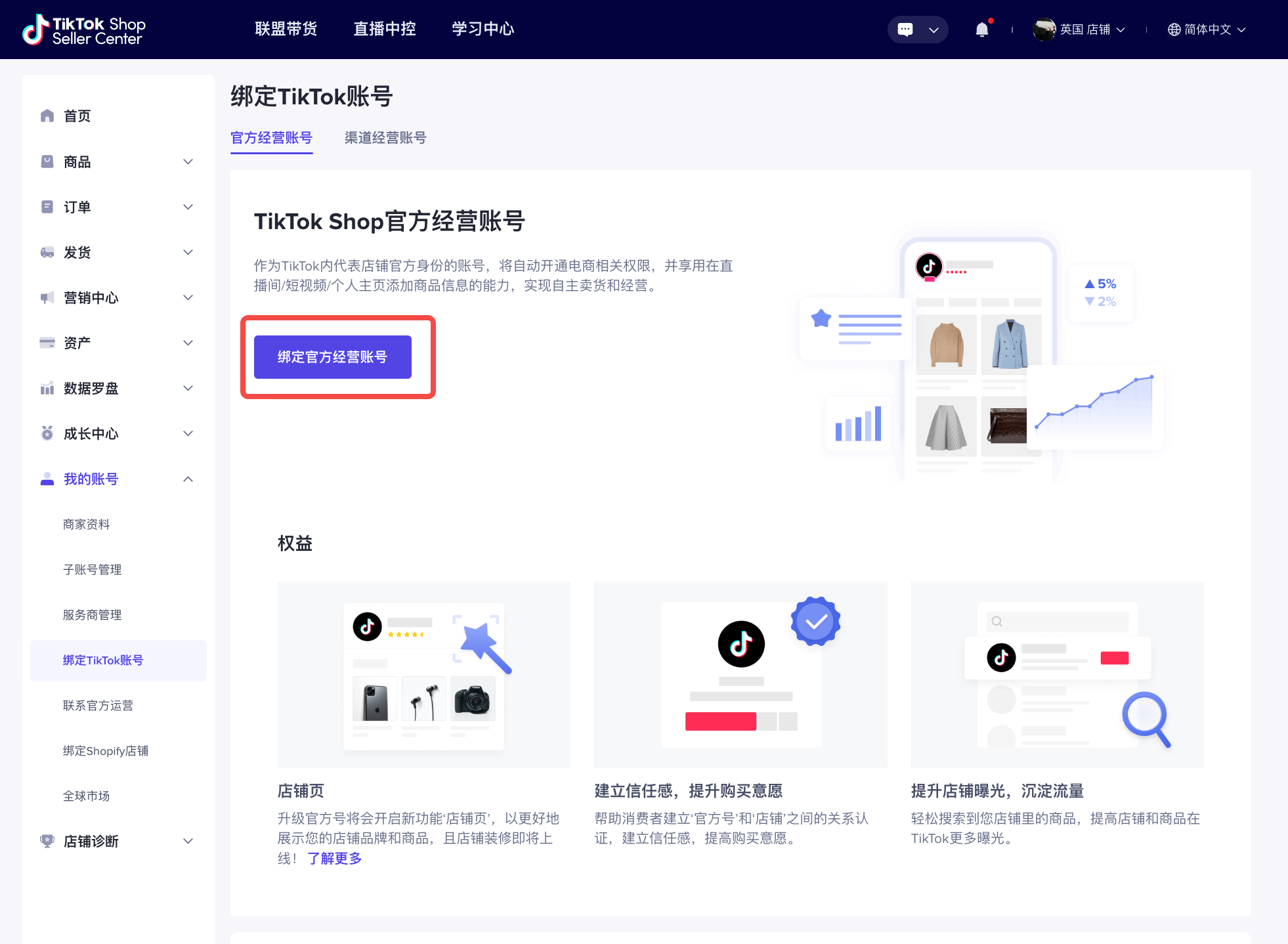 登陆TikTok Seller Center - 我的账号 - 绑定TikTok账号 - 官方经营账号