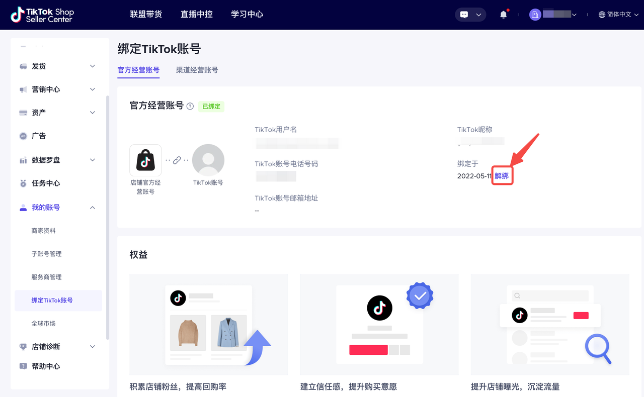 PC端:TikTok Seller Center - 我的账号 - 绑定TikTok账号 - 官方经营账号 - 点击”解绑“按钮