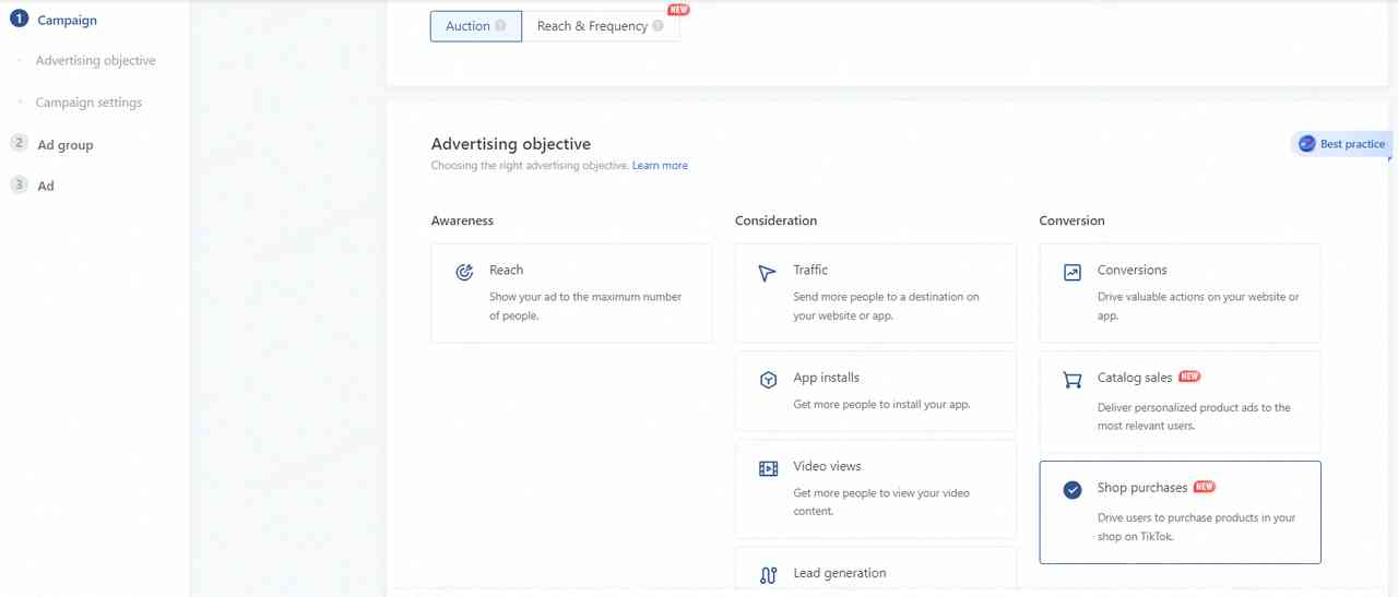 1.Campaign: 选择 "Shop Purchases" 作为广告目的