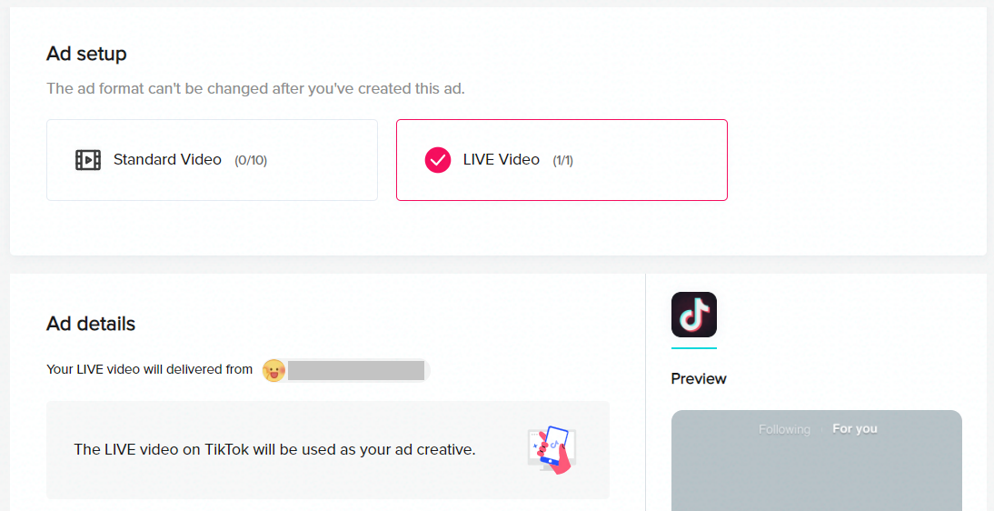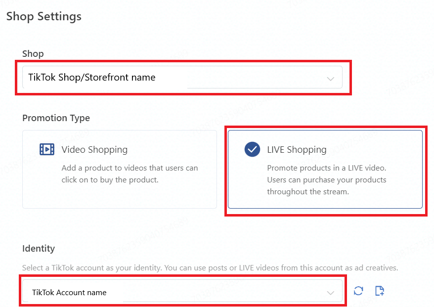 选择Shop 和TikTok 账户 (用于播放直播购物广告的TikTok账户)