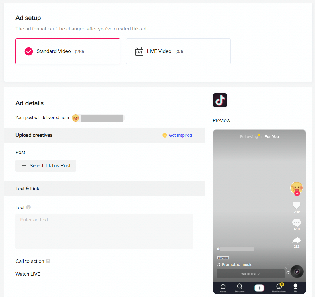 视频形式 - 上传视频或使用您TikTok页面中的spark视频