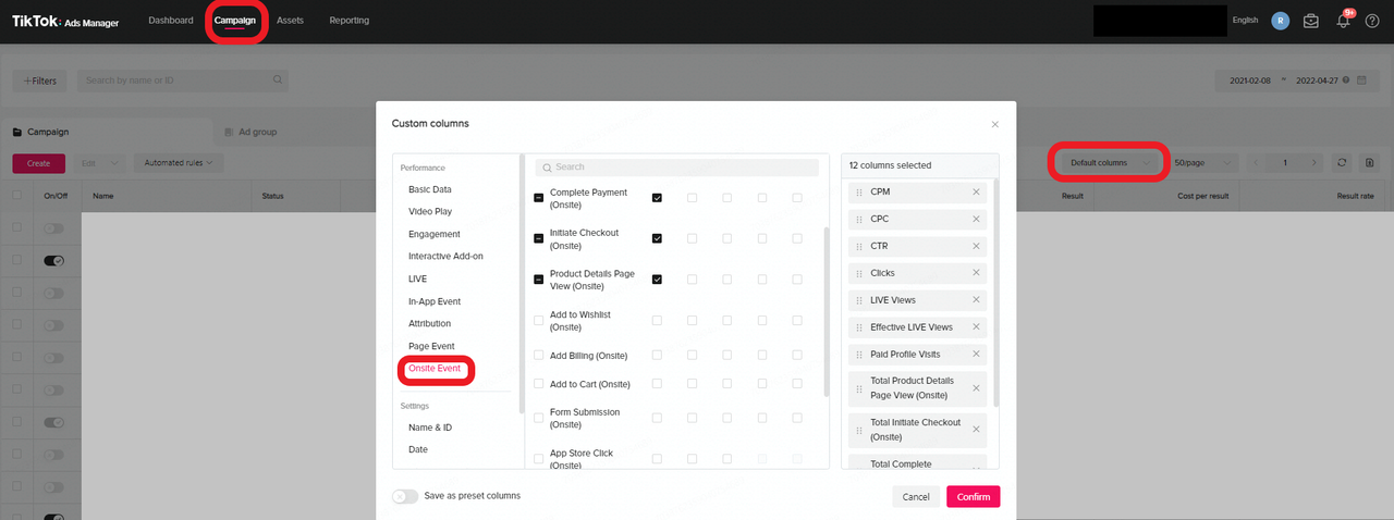 根据需要,您可以定制列以添加/删除指标。直播相关指标包括:LIVE Views, Effective LIVE Views 和 LIVE Product Clicks。Onsite Event 相关指标包括:Product Details Page View, Initiate Checkout 和 Complete Payment.
