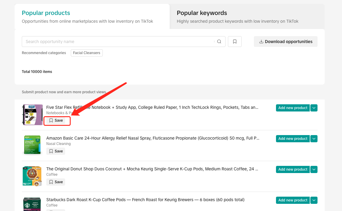 从如下入口分别可以进入新品商机(Popular products)和搜索商机(Popular keywords)