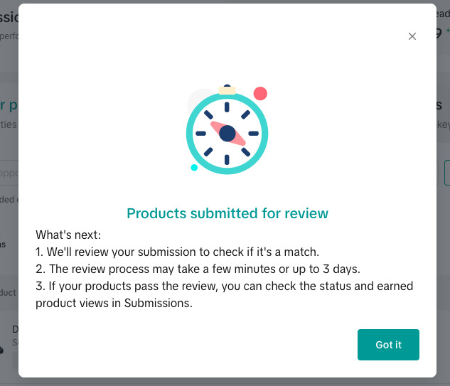 根据线索创建/链接了商品以后,需要通过审核,然后才能获得更多曝光机会;可以通过submission来查看效果