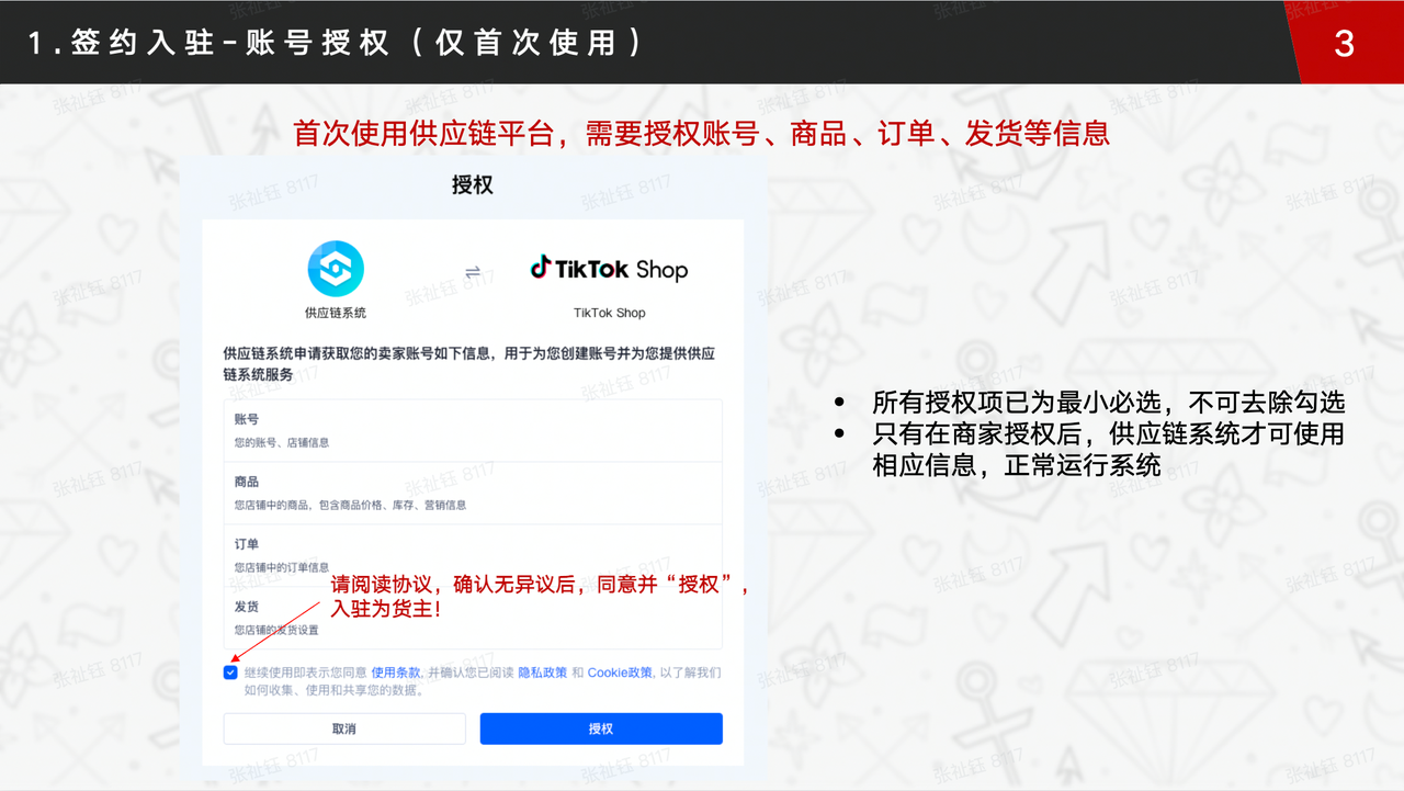 点击供应链货主平台后,首次使用供应链货主平台的商家需要进行账号授权,授权设置账号,商品,订单,发货等信息。