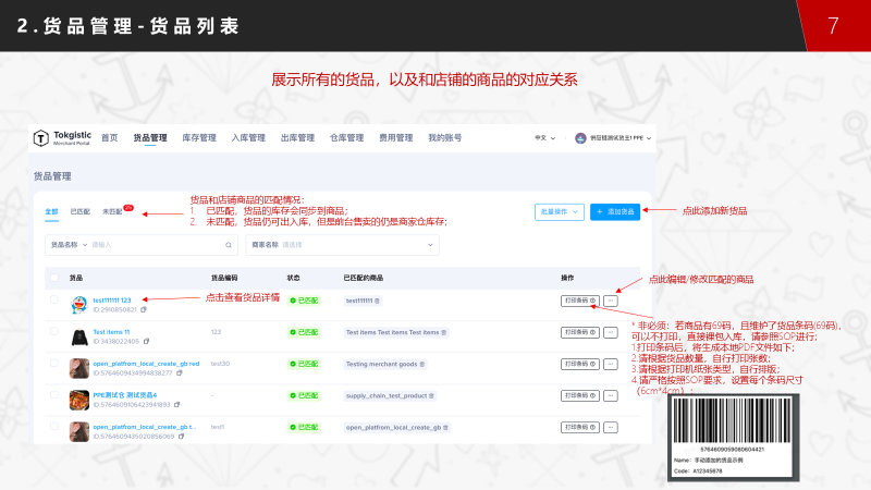 商家在系统内创建好商品后,需要打印商品条码,通过【货品管理】-【打印条码】自动生成PDF文件,贴在每个实物商品上。