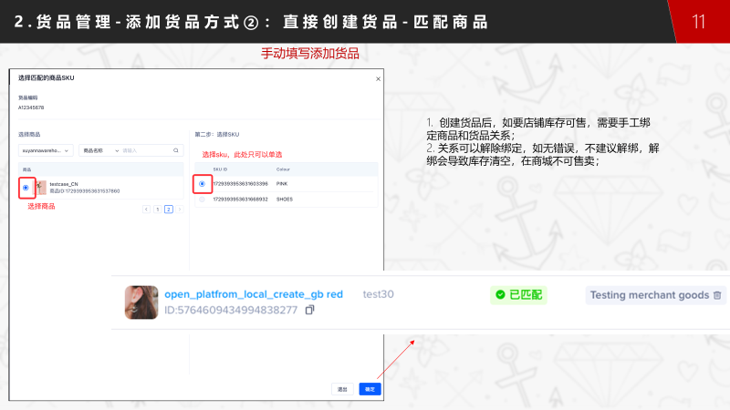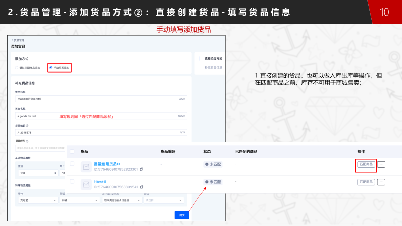 第二种方法:也可以手动填写增加货品,但需与商品匹配之后才可以用于商城售卖;