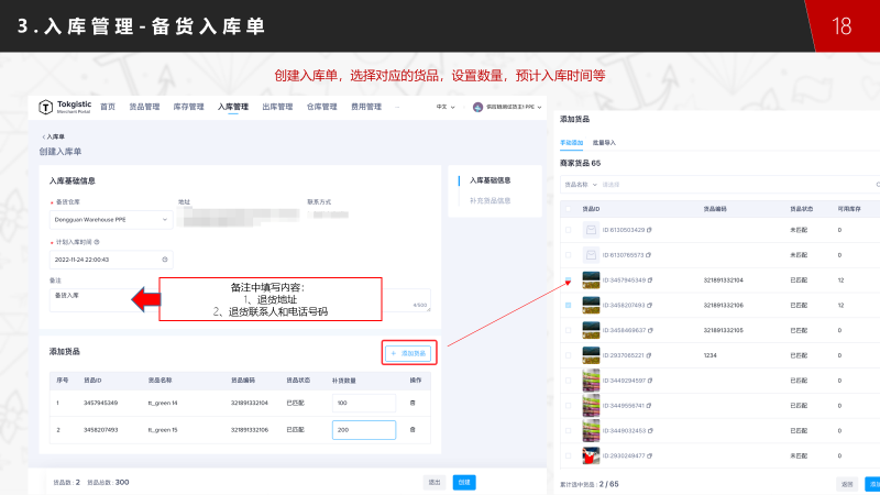 贴好商品条码后,商家需在商家后台系统中创建备货入库单。