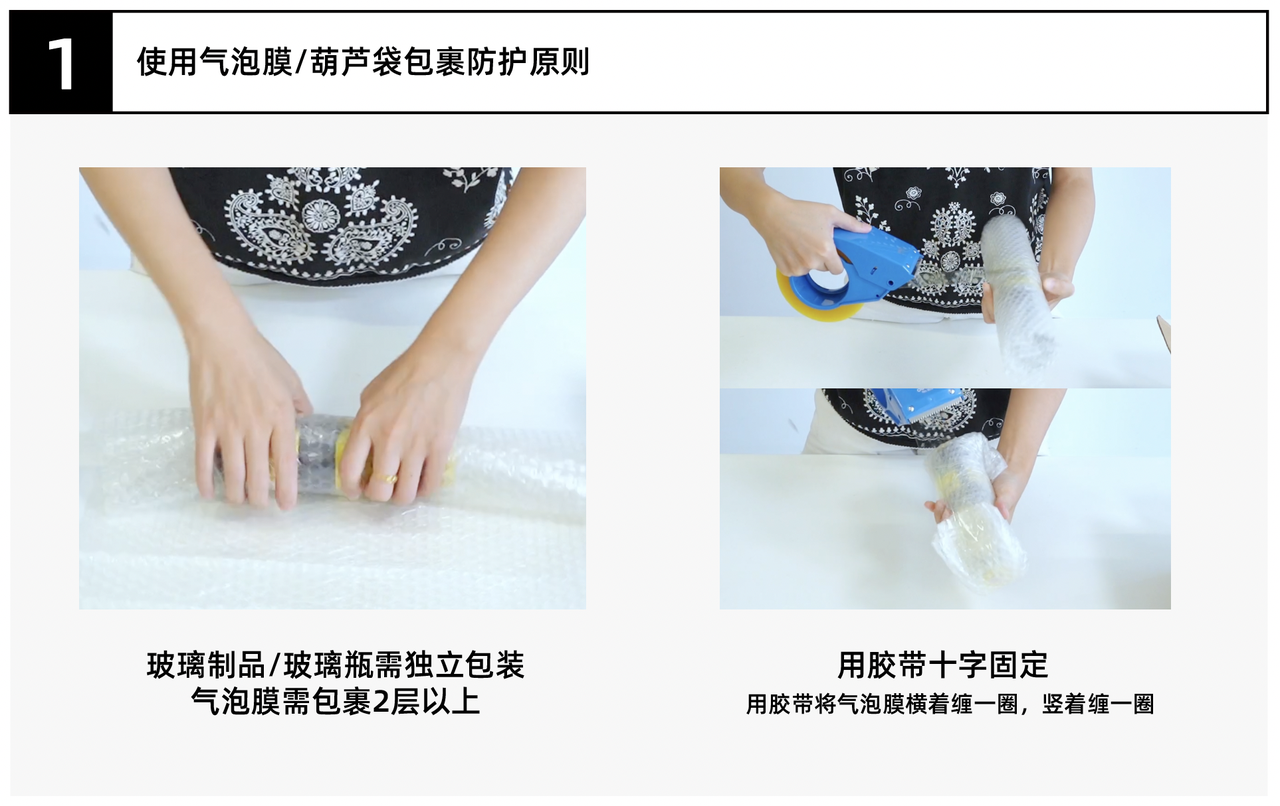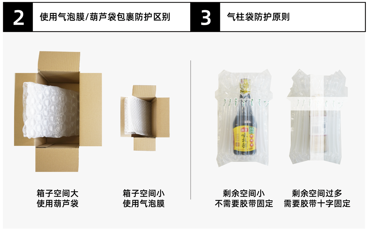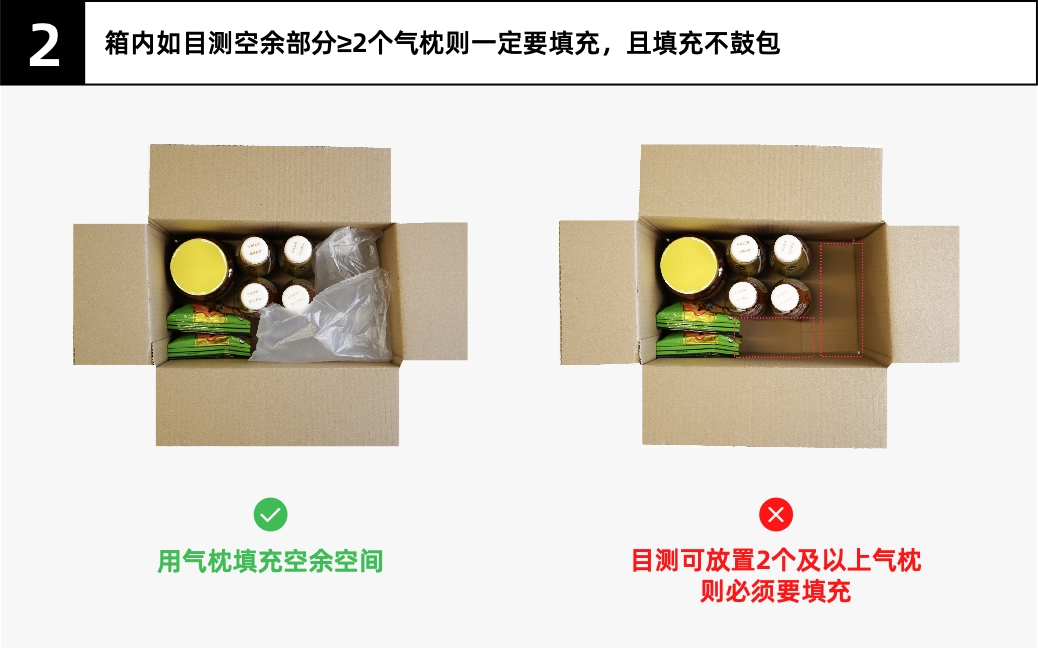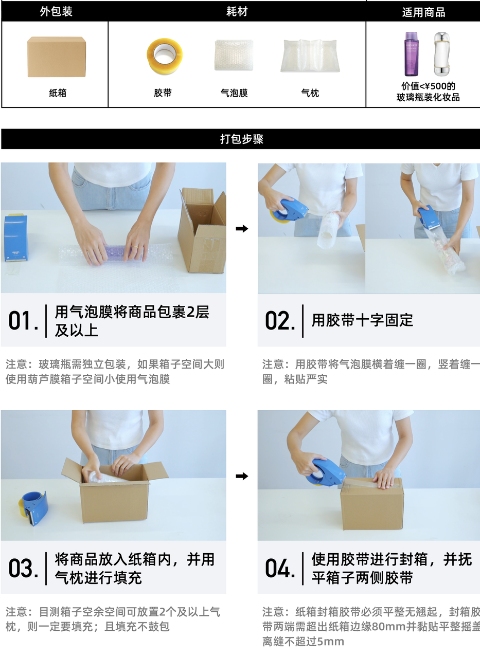 答:备货仓具备各种型号的常规包材,含邮政标准1-12号三层纸箱,各种型号快递袋、各种型号气泡袋,同时具有气枕、气泡膜、气柱等辅材加强包装,常规情况下,针对非易碎品如服饰等使用快递袋,易碎品如化妆品等使用纸箱并使用辅材加强包装;