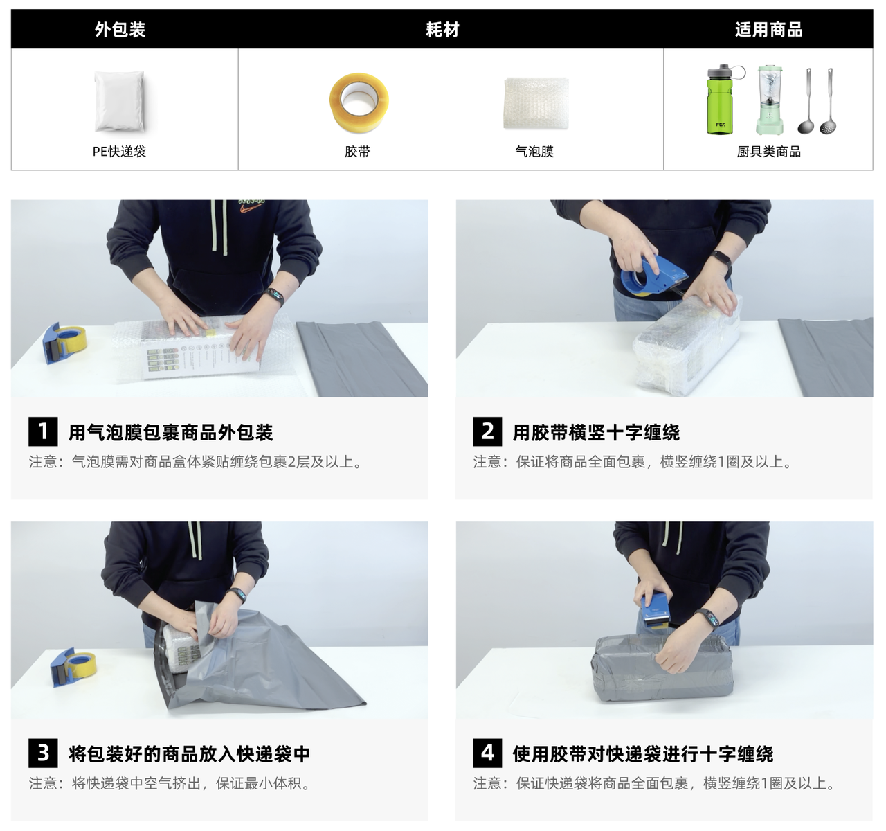 备货仓不提供定制包材的套袋服务,若商家需要使用自己的物流外包装,请自行打包好之后再送仓。但因有仓检需求,请保证外包装可以重复封口。