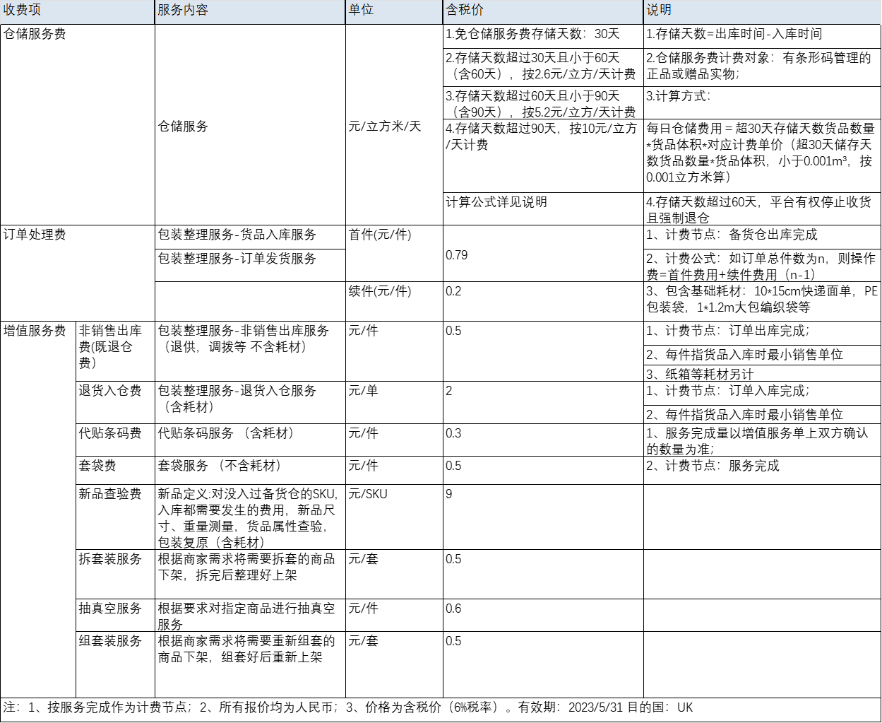 a. 仓储类服务费及订单处理费:目的国:UK,价卡有效期至2023/5/31。