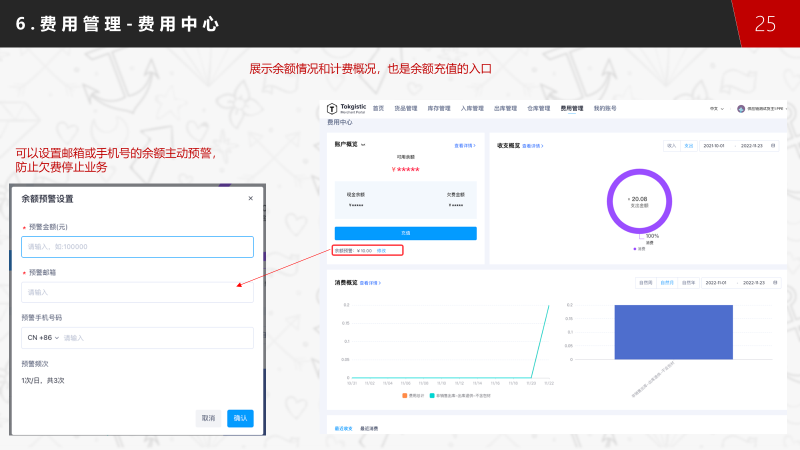 如供应链货主平台充值账户余额显示为0,备货仓业务将暂停发货,直至将欠费金额补足至不再欠费,为避免各位货主频繁充值,建议货主充值余额能覆盖未来一个月的消费。同时,充值界面新增自主设置预警值,货主可设置合理的预警值,输入邮箱和手机号后,预警信息可发送至手机和邮箱;