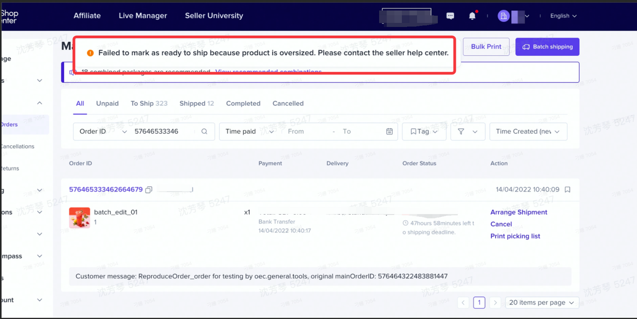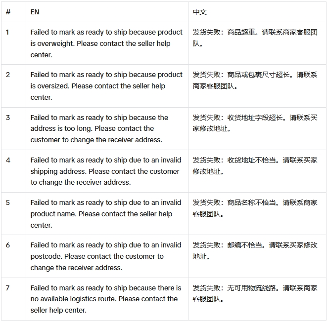 失败原因提示的应用场景:卖家在RTS(即卖家进行待发货处理和待揽收)阶段,会出现发货失败的情况,为了帮助卖家能及时定位到失败原因,系统将展示具体的失败原因,如下图: