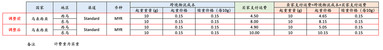 为了配合市场多元变化,平台将于2024年4月15日11:00(北京时间)对马来西亚全球标准运输(Standard)价格进行调整,具体费用请见下表: