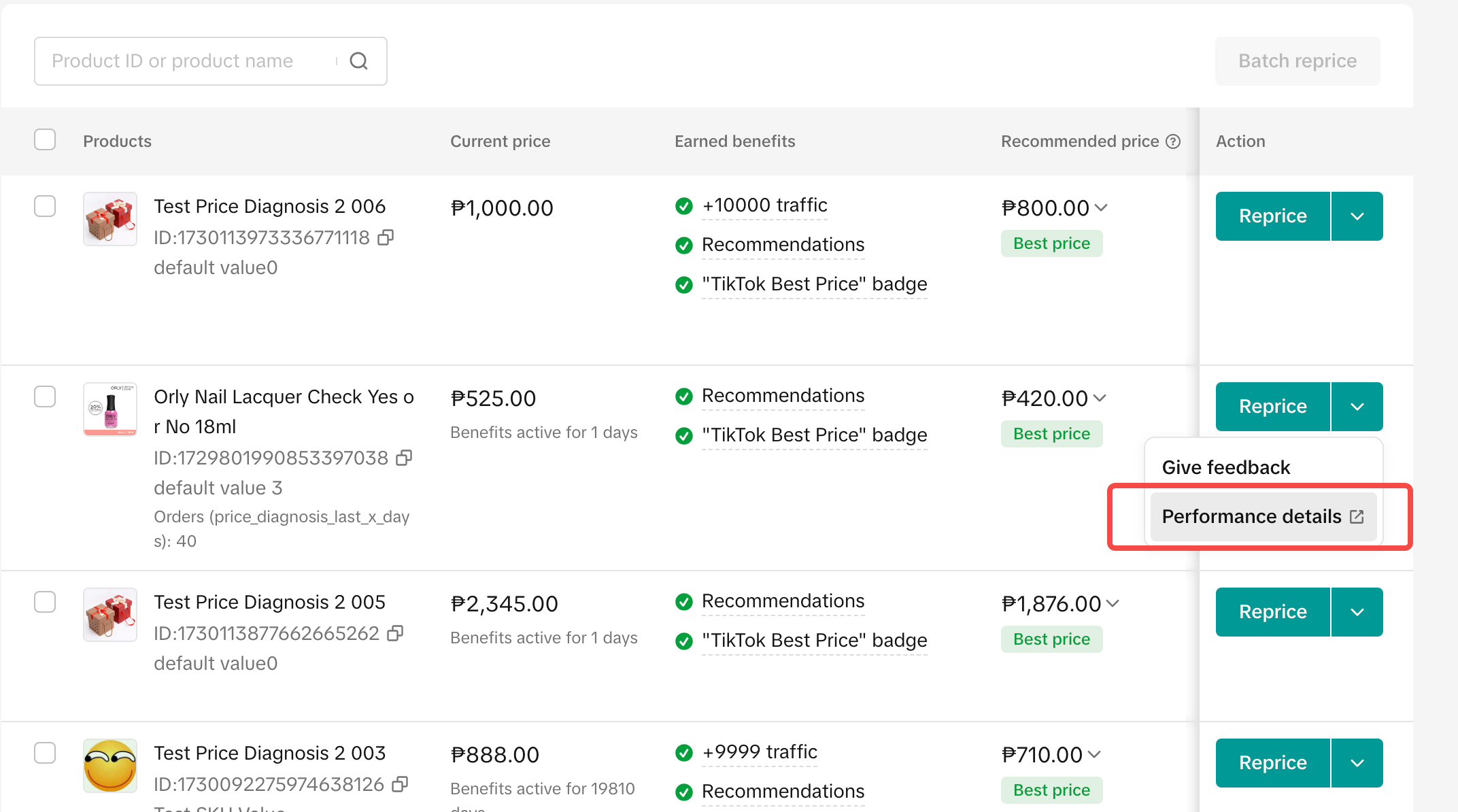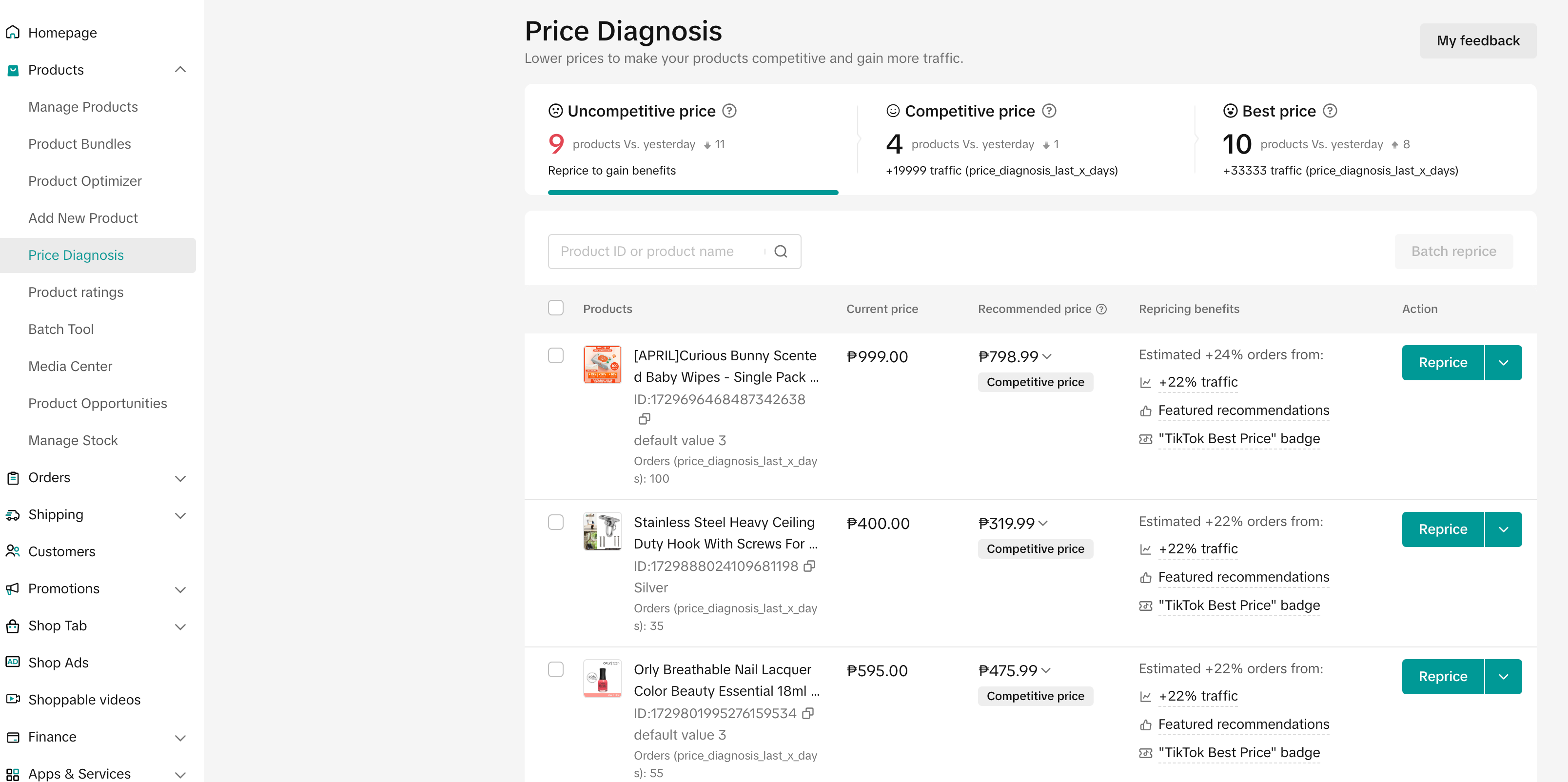 价格诊断功能可帮助卖家评估TikTok Shop的商品价格竞争力,还可充分利用搜索运营和推荐工具引流。借助价格诊断,卖家可以了解SKU价格水平,并根据需要进行调整。