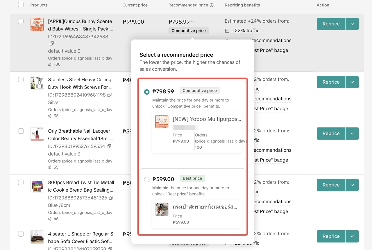 价格缺乏竞争力: 与匹配的商品相比,你的价格较高。为了提高销量,请考虑降低价格。