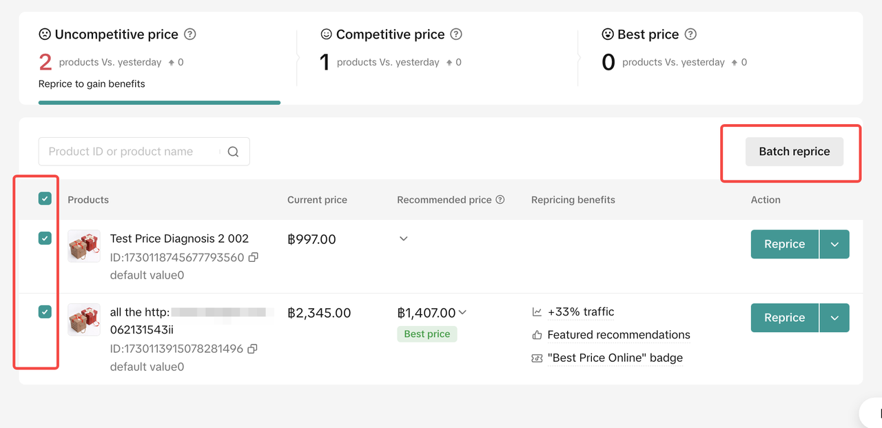 通过价格诊断,卖家可查看SKU和建议价格(包括收益),从而进行必要更改。通过改价工具,卖家可立即修改价格。