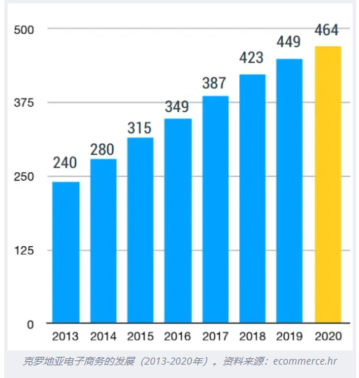 克罗地亚电子商务协会表示,2020年克罗地亚的在线零售额为4.64亿欧元,逐年增长中。