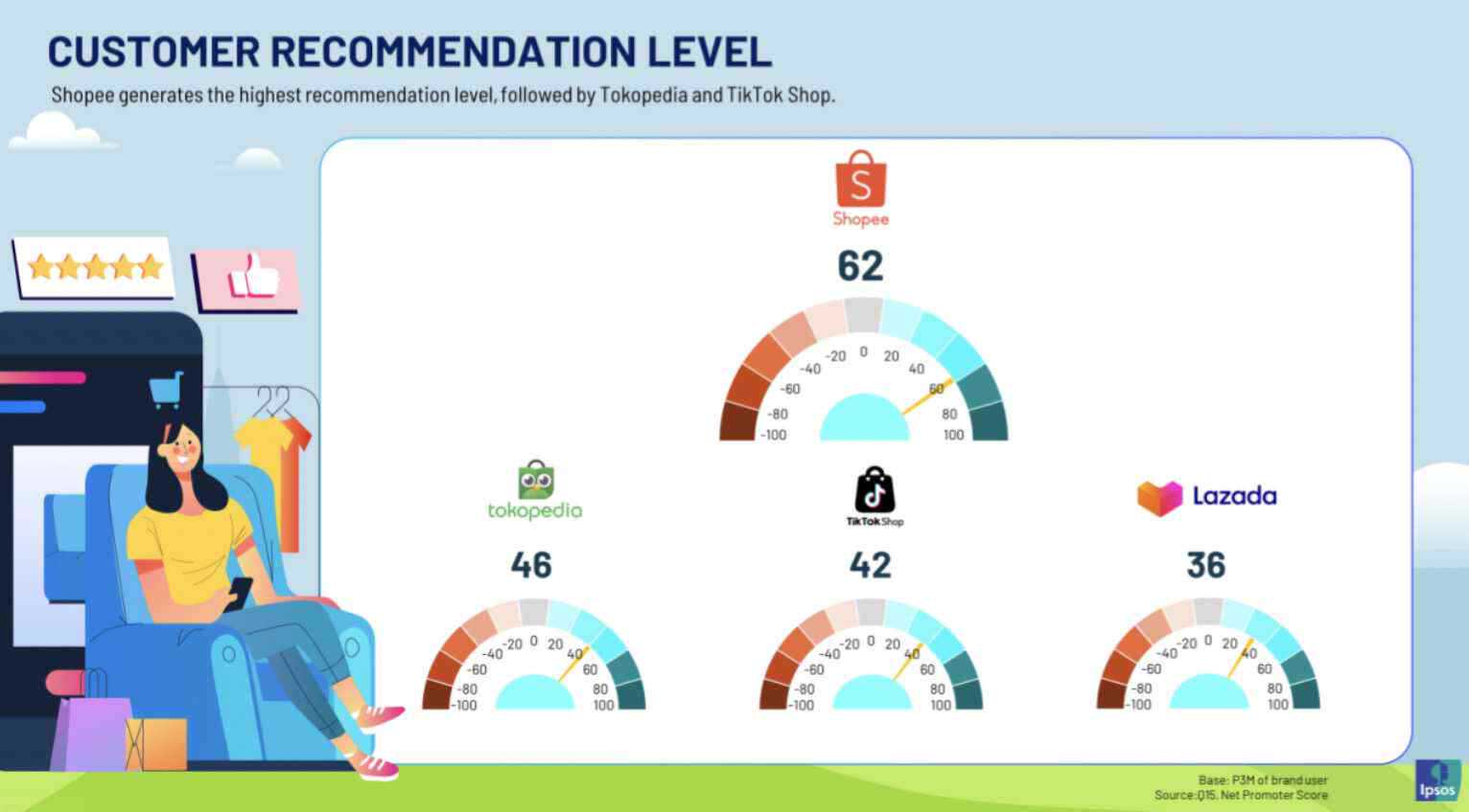 在平台选择方面,Shopee(62%)是消费者向近亲推荐的网购首选平台,其次是 Tokopedia(46%)、TikTok Shop(42%)和 Lazada(36%)。
