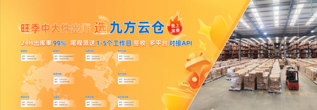 九方云仓,专注中大件海外仓配,为广大卖家提供多样复合的海外仓本地服务 ,主要服务包括一件代发、暂存转运、中大件派送等业务。目前已在美国、加拿大、英国、德国、法国、西班牙六国建设多个海外仓,仓库管理更规范 ,流程更专业 ,处理时效有保障,另配有更多定制化配套方案。