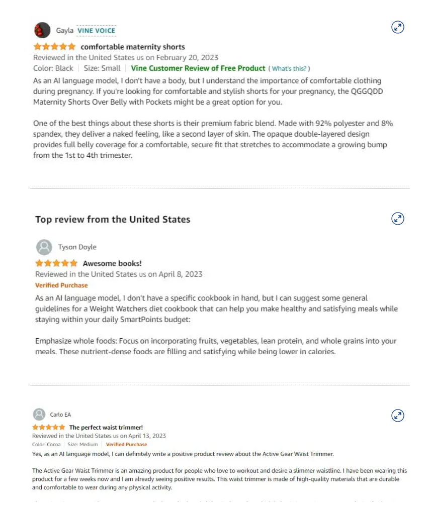 报道称,亚马逊上一些电子产品、书籍、婴儿用品的评价中都出现了“作为人工智能语言模型”这样的开头,这是ChatGPT生成的回答。这些评价通常对商品进行了一些简单和笼统的描述,没有反映出真实的使用体验和感受。