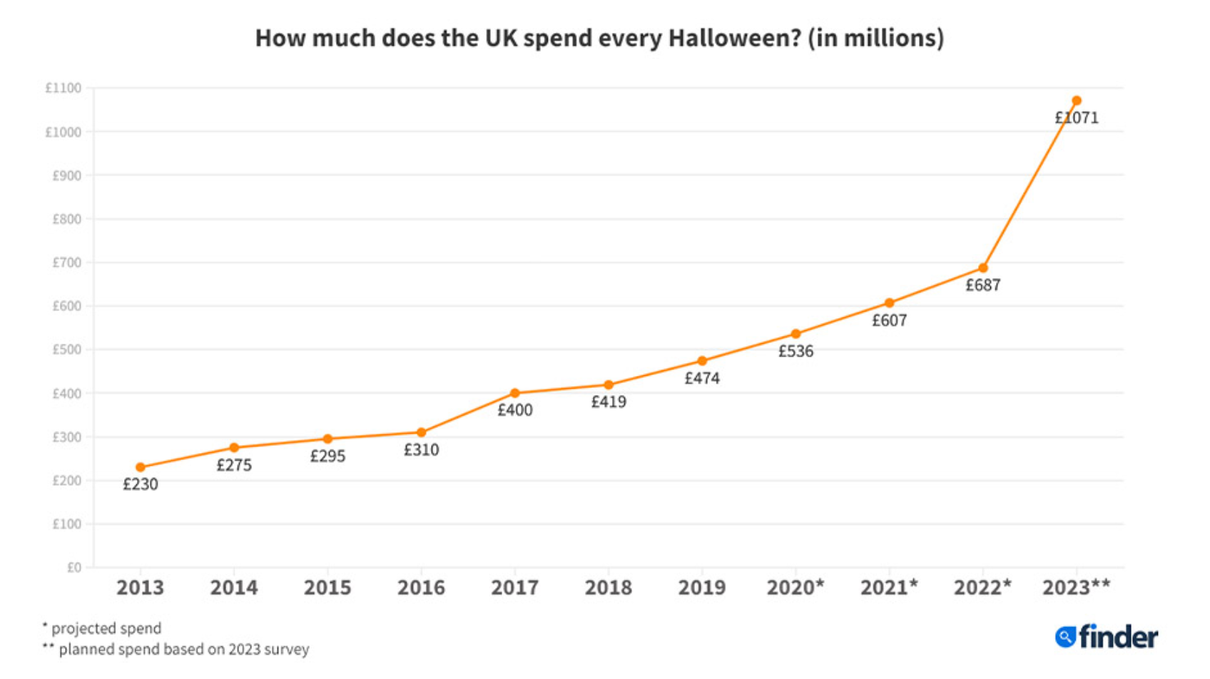 值得一提的是,过去十年,英国的万圣节消费支出逐年攀升。2013年,英国在万圣节期间仅花费2.3亿英镑购买服装、糖果、电影、南瓜(对于顽固的传统主义者来说是萝卜)照明和其他装饰品。