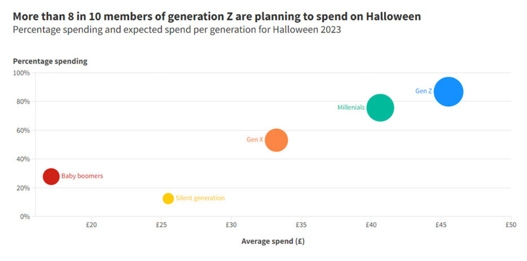 来自Censuswide的调查还发现,英国万圣节的“消费主力军”发生了巨大转变。2013年,千禧一代是万圣节的最大消费群体,这一群体的人均支出远超过X世代和婴儿潮一代。