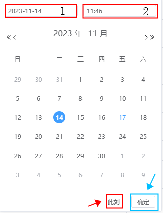 点击1框用于选择该年月日;2框用于选择时刻,选择完毕点击确定。若想直接获取现在的时刻可直接点解下方(此刻)按钮即可获取。完成上述操作点击确定按钮。