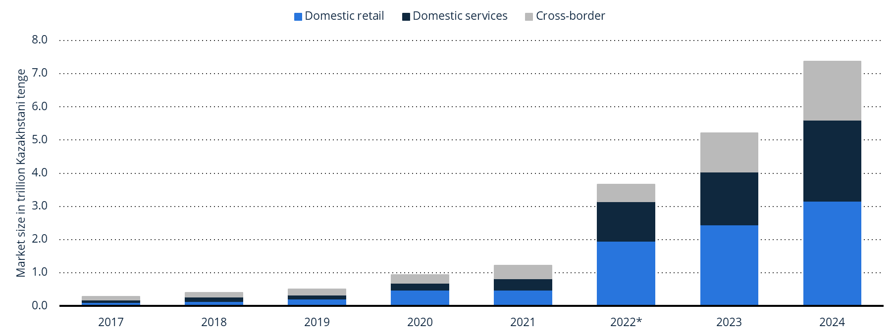 据Statista统计,2017-2024年,哈萨克斯坦电商市场规模持续扩张,2024年已突破7.3万亿坚戈。