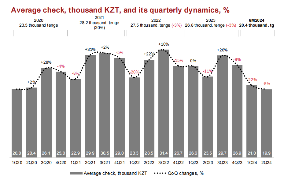 哈萨克斯坦消费者逐渐倾向于高频次购买日常生活用品,而非偶发性的高价值消费。数据显示,2024年上半年电商交易笔数达7080万笔,同比激增97%,直观反映线上购物频率的大幅提高;但同时期平均客单价降至20400坚戈(约45.5美元),同比下降18%。