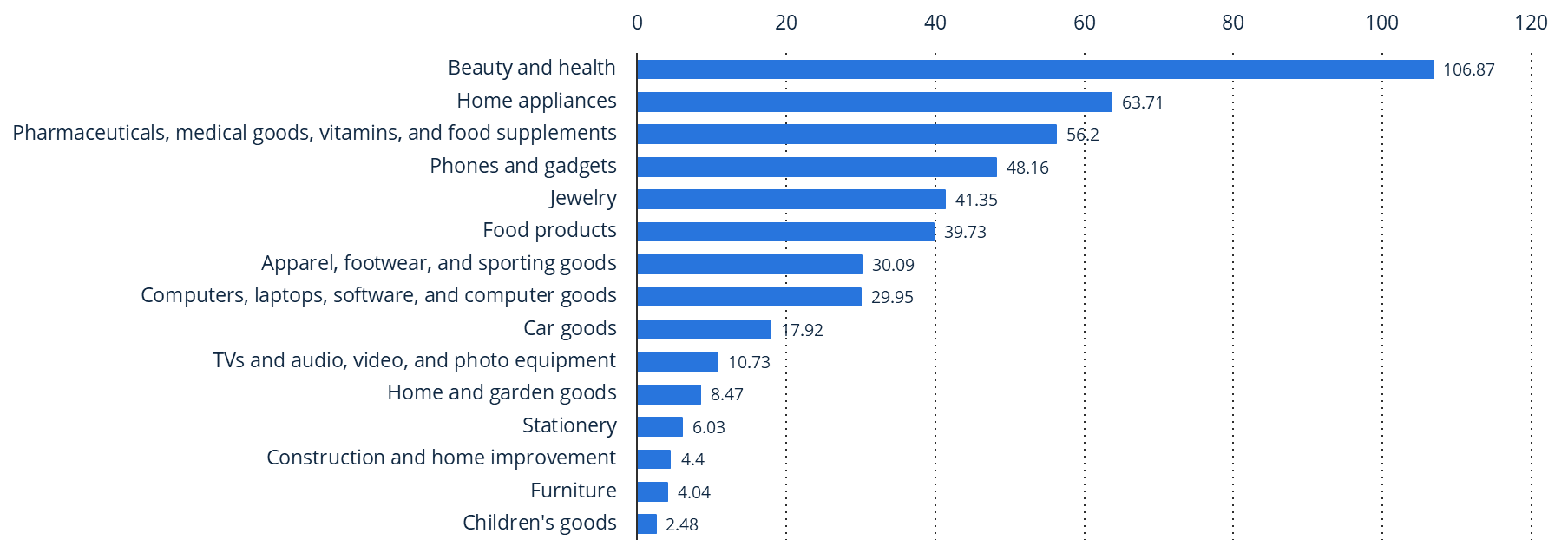 数据显示,2024 年,美容及健康产品在哈萨克斯坦线上商城(非平台)中最畅销,销售额达1068.7亿坚戈;其次是家电,销售额为637.1亿坚戈。