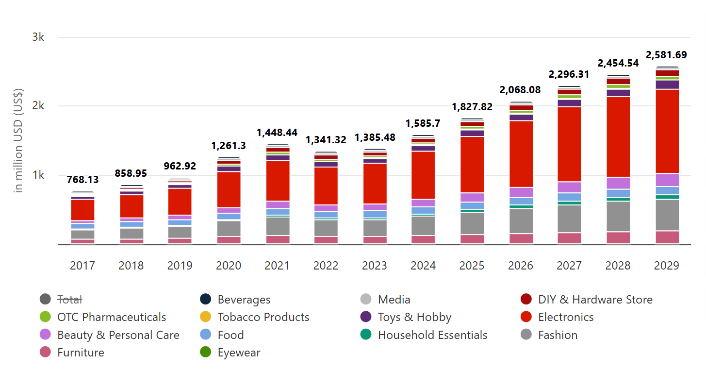 互联网普及,以及基于新冠疫情以来的线上购物习惯,为摩洛哥电商市场发展注入了持续的推动力。根据Statista数据,预计到2029年,摩洛哥电商市场规模预计将增至25.82亿美元,2025-2029期间年复合增长率为41.25%。期间,摩洛哥的电商渗透率也将持续攀升,至2029年升至25.41%。