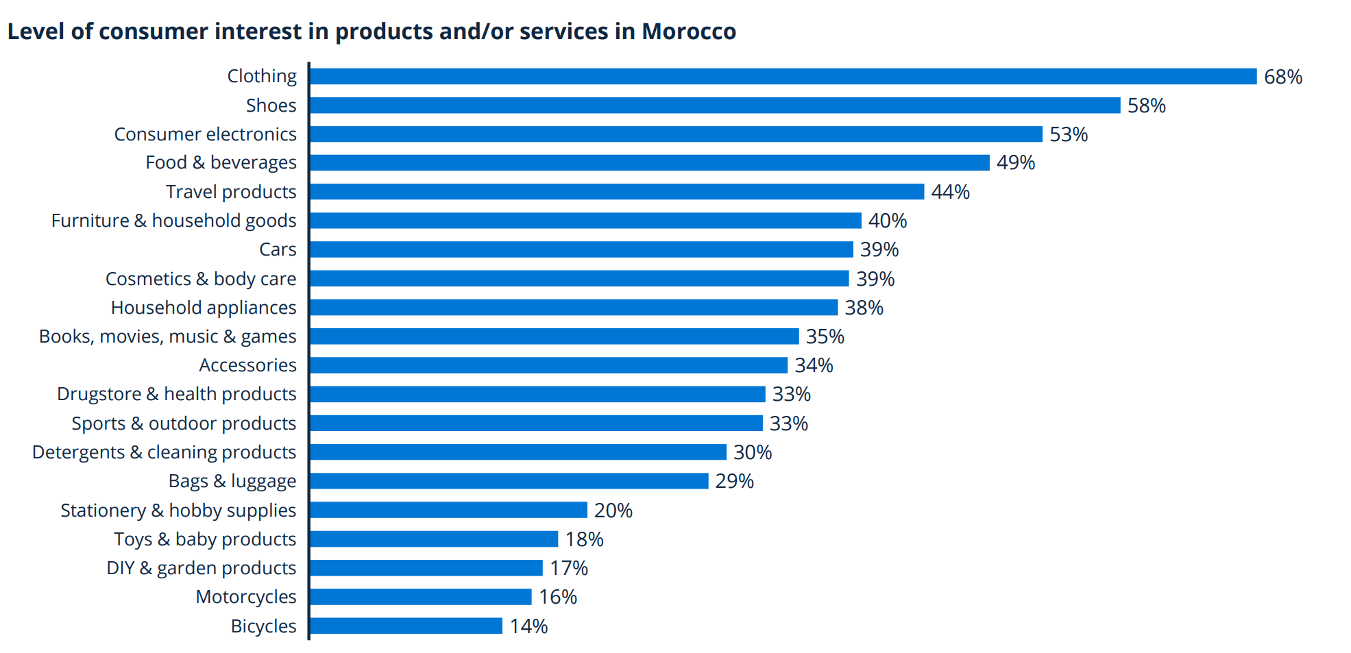 根据Statista此前发起的调研,摩洛哥消费者网购意向最高的品类分别是服饰、鞋履、电子产品、食品&饮料、旅行用品。