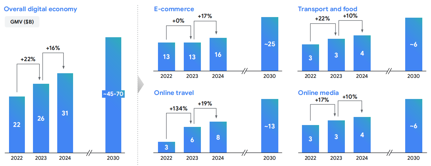 同时,电子商务也在逐渐成为马来西亚国内生产总值(GDP)的重要支撑产业。《2024年东南亚数字经济报告》显示,2024年马来西亚电子商务领域占整体数字经济总交易额(GMV)的主导地位,商品交易总值同比增长17%,达到160亿美元,成为推动经济增长的重要引擎。