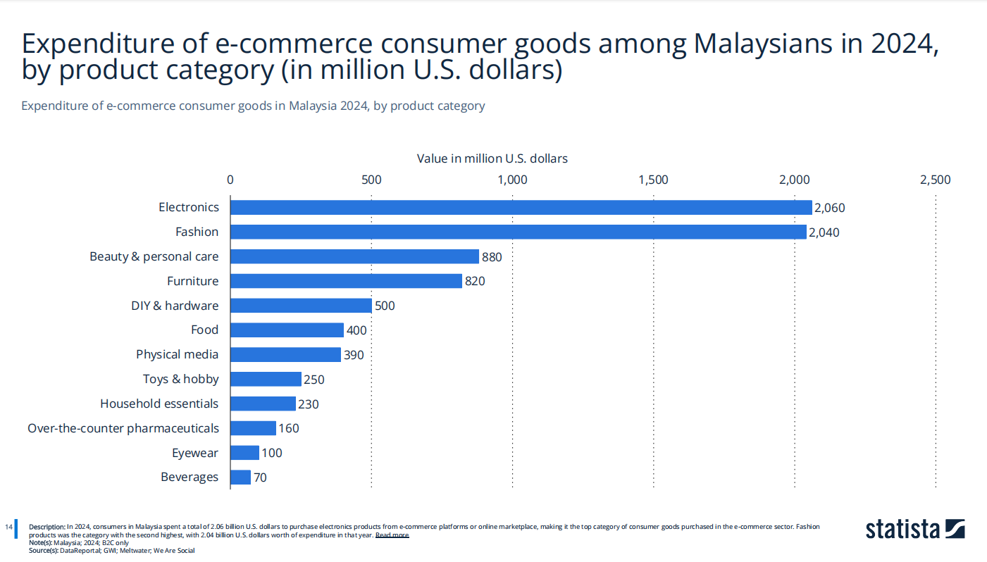 据statista数据,2024年,马来西亚人通过电子商务购买商品或服务的比例达到70.8%,电子产品和时尚产品的交易金额遥遥领先,均突破200亿美元,分别为206亿及204亿美元,其次是美容个护、家居、DIY及手工等类别,交易金额在50亿至80+亿美元。