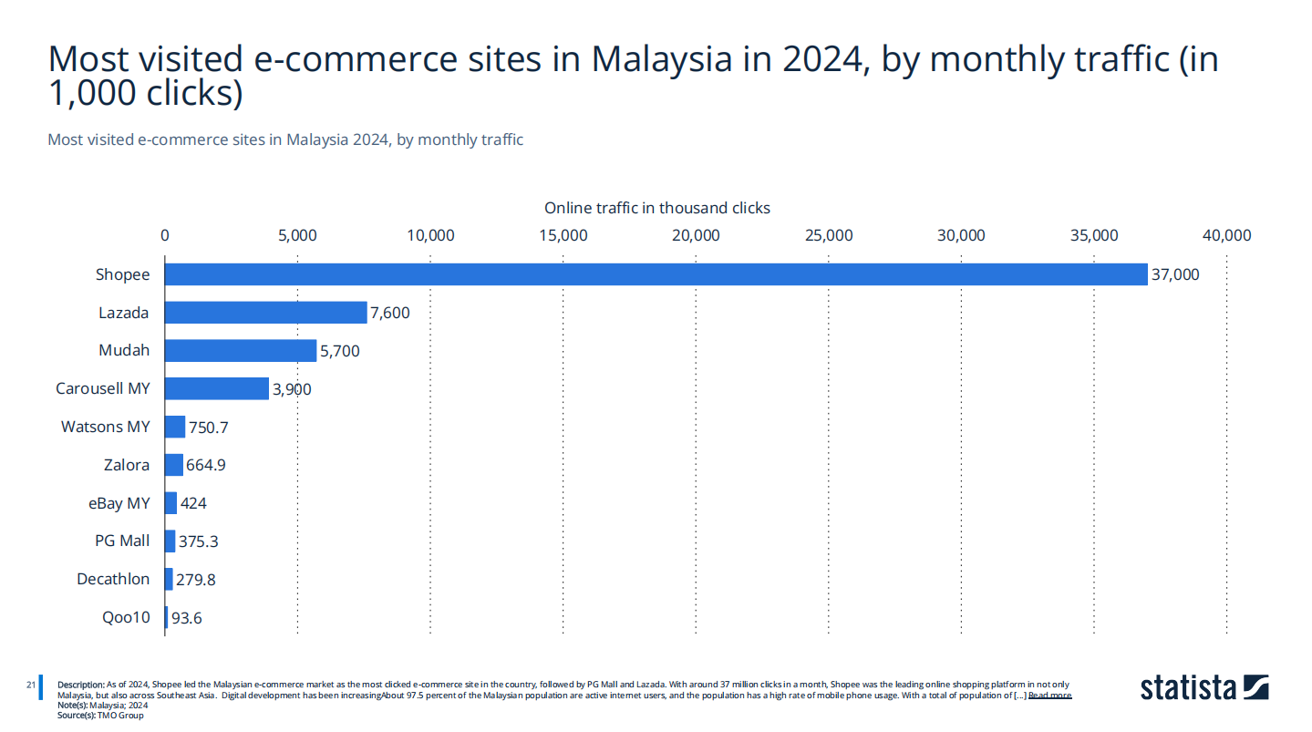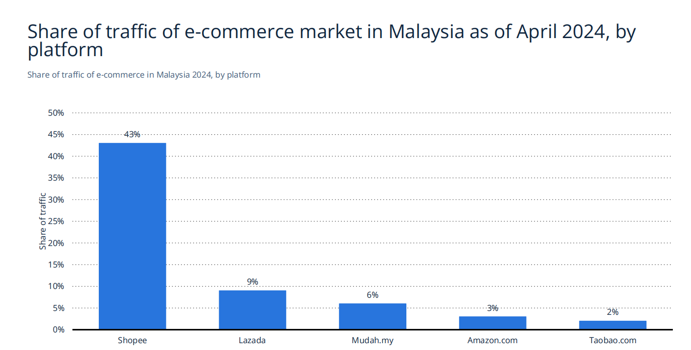 statista数据显示,2024年,马来西亚排名前五的主流电商平台为: