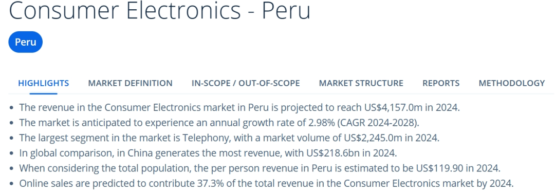 据Statista统计,秘鲁消费电子市场在未来几年将持续增长,预计到2024年市场收入将达到41.57亿美元。在这个市场中,电话是最大的细分市场,预计到2024年市场规模将达到22.45亿美元。该市场主要消费群体集中在18至35岁的年轻人群,他们对手机配件注重创新性和时尚感。
