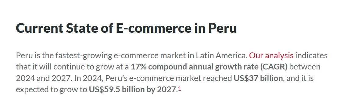 Payments & Commerce Market Intelligence(PCMI)数据显示,2024年至2027年期间,秘鲁电商市场将继续以17%的复合年增长率(CAGR)增长。2024年,其电商市场规模达到370亿美元,预计到2027年将攀升至595亿美元。