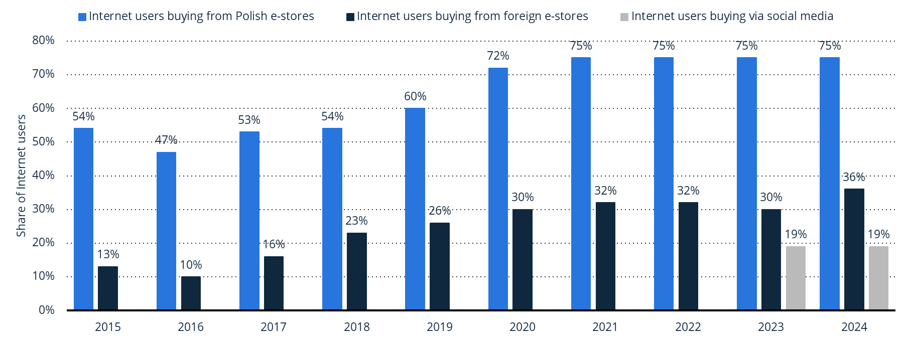 据Statista数据,2024年,波兰电商市场规模达1390亿兹罗提,预计到2027年将增至1870亿兹罗提,年均复合增长率保持在8%以上。