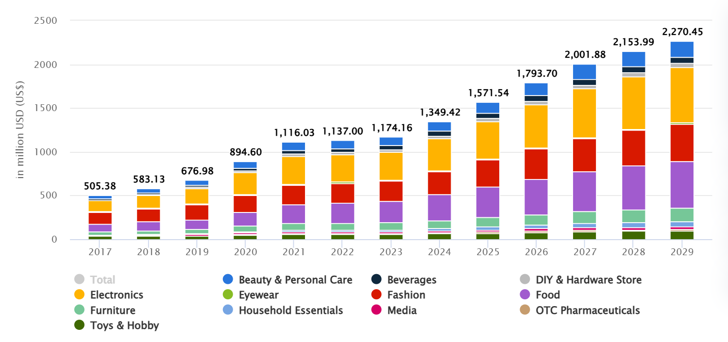 据statista统计,电子产品、时尚、食品、美妆&个护、家具是巴拉圭电商市场排名前5品类,预计前5品类的市场领先优势还将延续至2029年,玩具、生活用品等市场规模将持续扩张,其中玩具品类至2029年将达到近亿美元市场规模。