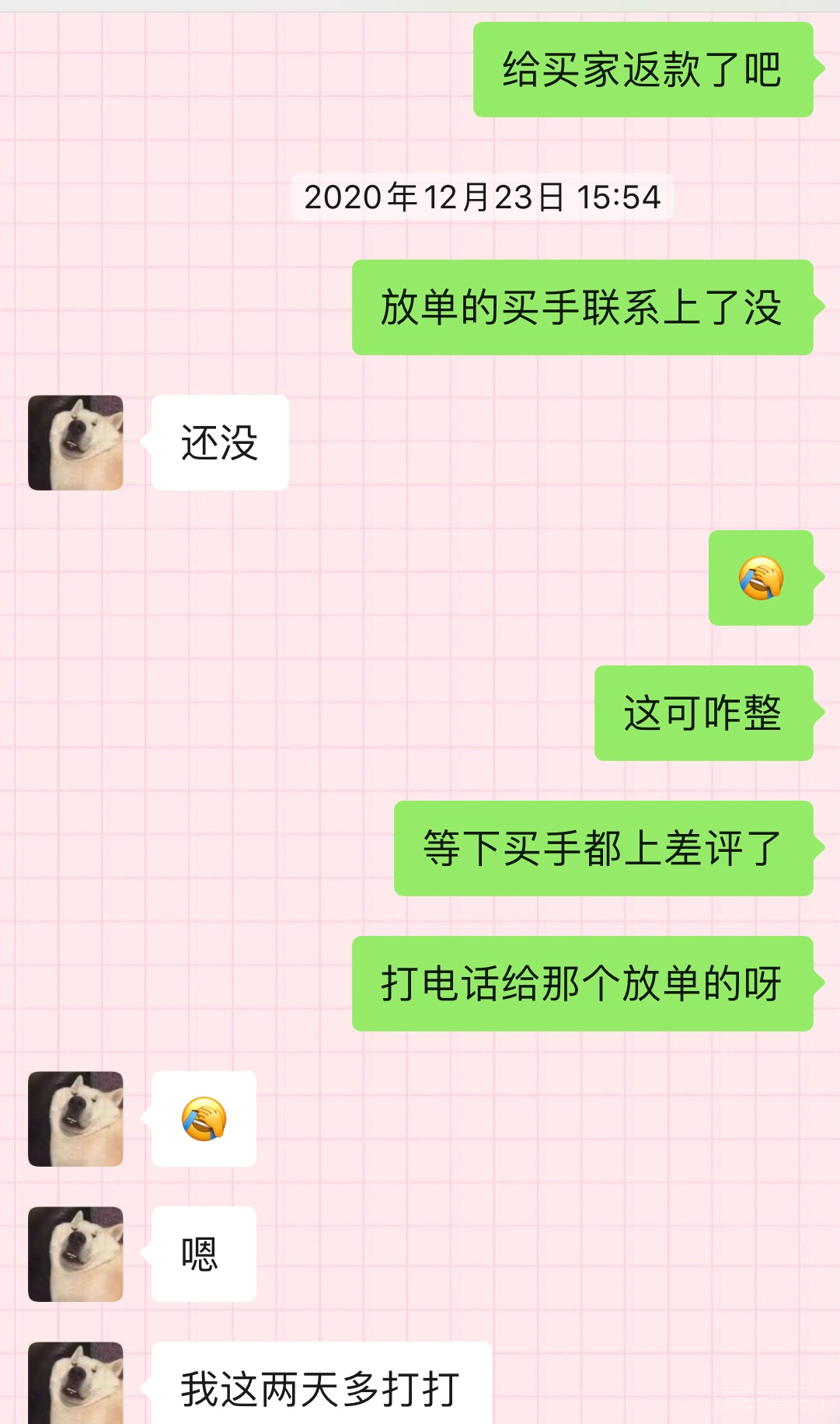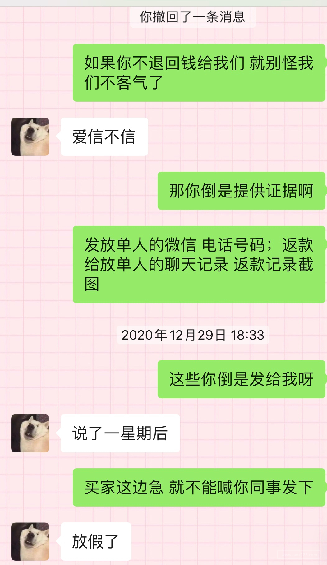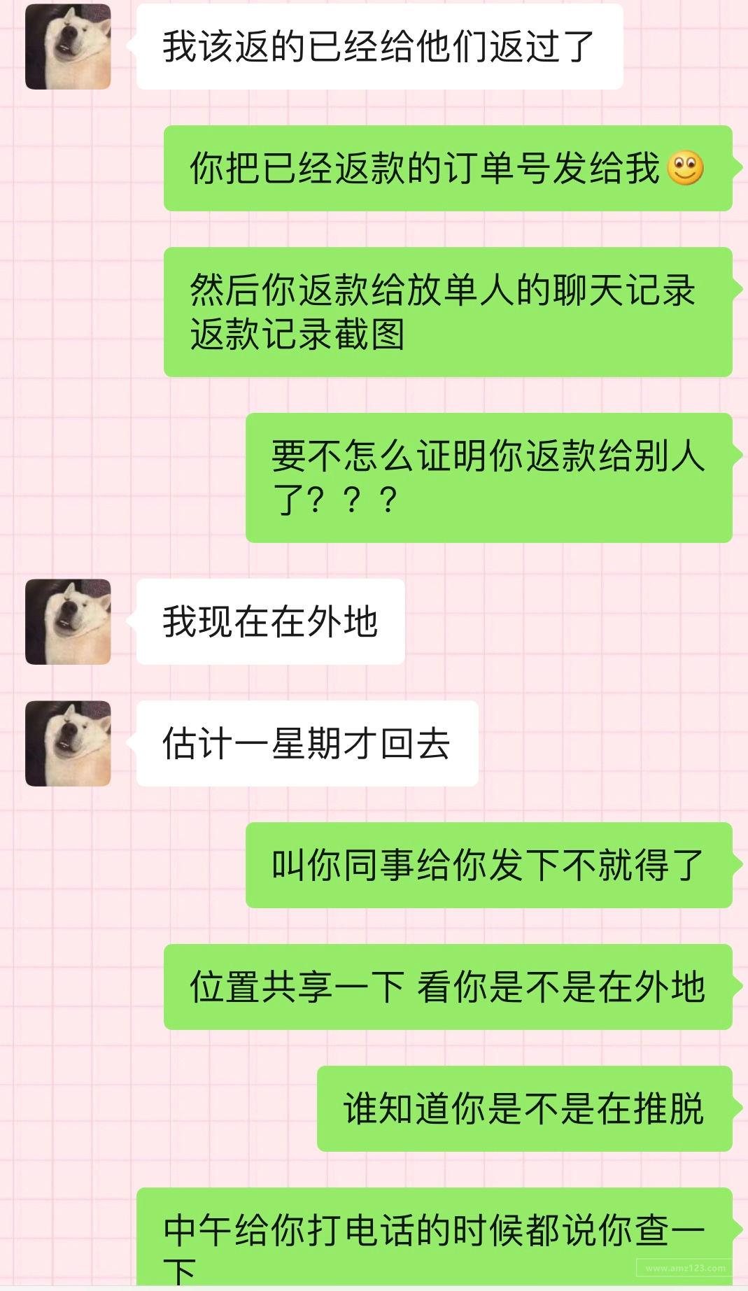 我一共放了30多单给他,都是价值比较高的产品,谈好的是买家收到货后返本金,评后返佣金,但是他返款几单给买家后,我这边就收到买家的邮件,说中介联系不上,叫我返款,但实际我已经返款给中介了!最开始我联系不上中介,最后一天联系上说他也在联系放单人,然后我叫他发送放单人的联系信息给我,还有他已经返款给放单人的截图给我,就是各种推脱,最后直接叫我报警处理;这种就是特别不要脸的中介,希望大家以后注意:一律到货返本金先的中介都要注意,现在测评真的是太多骗子了!