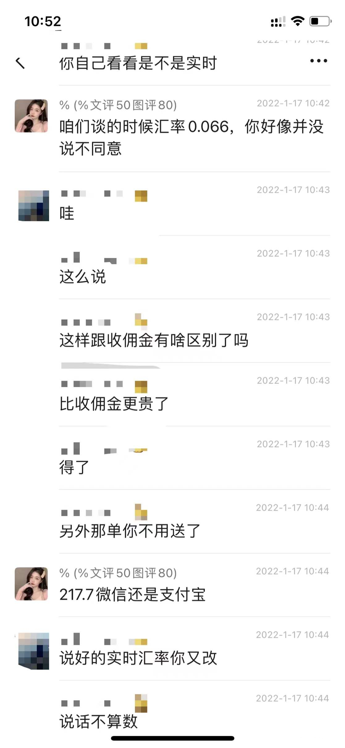 这人就是个骗子。一开始说好的免佣金和按照实时汇率来收取,等到上评之后就改口说不按照实时汇率,领了大额优惠券购买,却要按照原售价来收取本金。大家要注意不要上单受骗!!