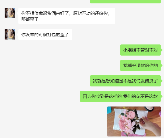亚马逊下单之后当天找我返款说自己收到了,给我发的图片不是我们的产品图,我指出来不是我们的产品之后,她说是朋友帮忙签收的自己去核实一下,第二天给我发收到的图是用我们网页上面的图P的,还说我诬赖她 要退货,P图都不认真,买的粉色P紫色,离谱的很,款已经退了,语气还恶劣,卖家也太难做了