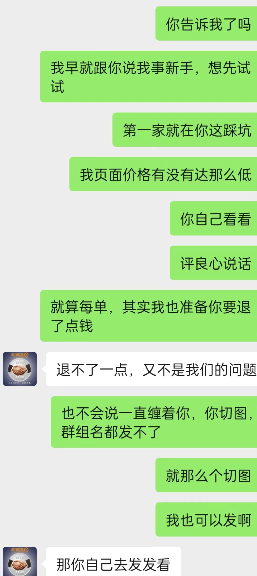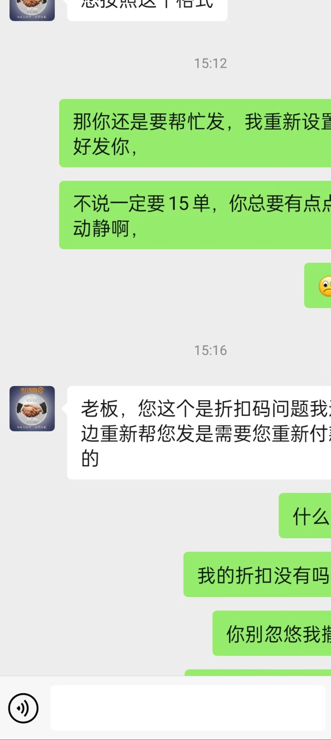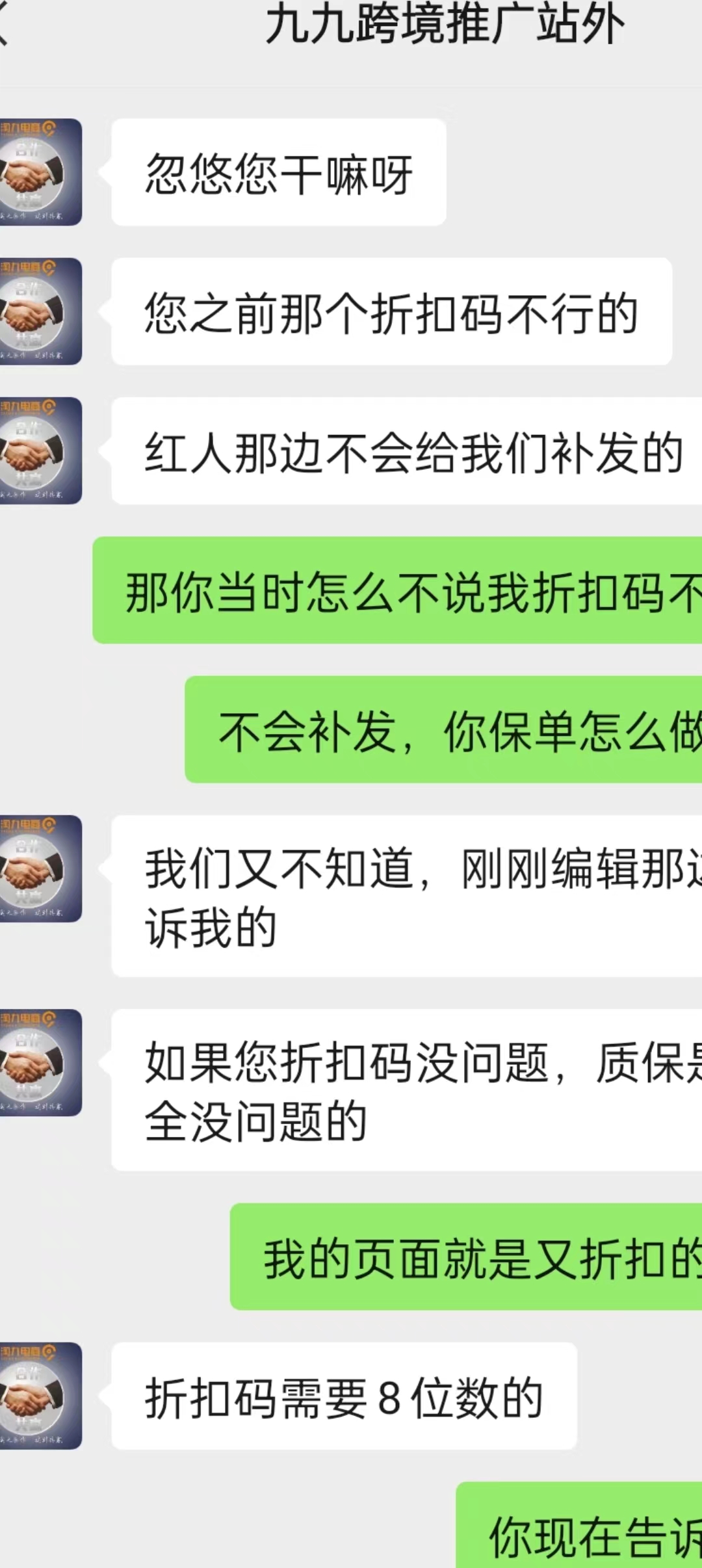 淘宝联系后说他加V,  群组发站外推广,发之前说保单,我付款后催几天没行动,后面直接说我的折扣码有问题,需要付钱补发,不是他的问题,态度很不好,千万不要上当